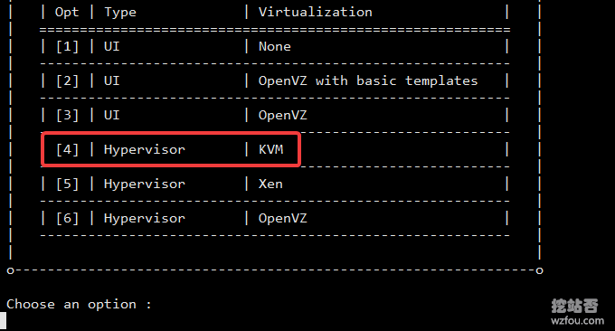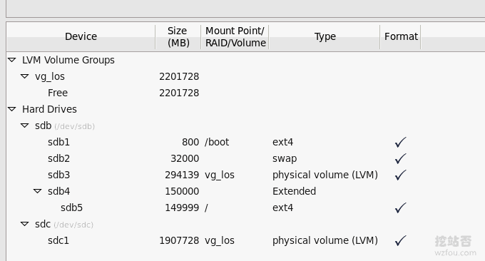 这里wzfou.com采用的是KVM被控端,按照要求给80GB以上的空间挂载在“/”,保持4GB以上的SWAP,剩下的空间全部给Logical Volume Group (LVM),仅Logical Volume Group Only。并且PE设置为128M。