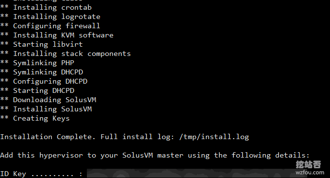 稍等一会儿,我们就可以将SolusVM被控端Slave安装完成,记下给出的ID和Key。