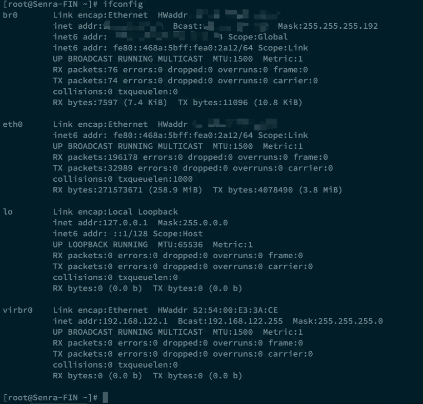 在配置这个之后,如果你发现自己服务器失联,请使用控制面板上的重启来使机器重启恢复,当然,在你成功配置后记得把计划任务删掉。配置完大概是这样的,那个virbr0不用管,是自动添加的一个,如果看官方文档还可以配置一个内网用的Bridge,这个就看你自己需求了 。