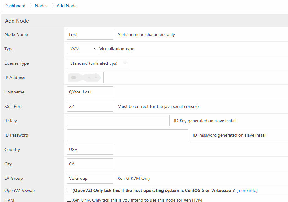 填写你的Node的基本信息,输入刚刚安装SolusVM被控端Slave生成的ID和Key。特别注意:LV Group这个值,一定要填写和我们之前分区指定的名字一样,如果你不知道名字请使用命令:vgdisplay