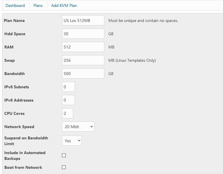 点击Plans-Add KVM Plan,设置好硬盘、带宽、内存等VPS配置。